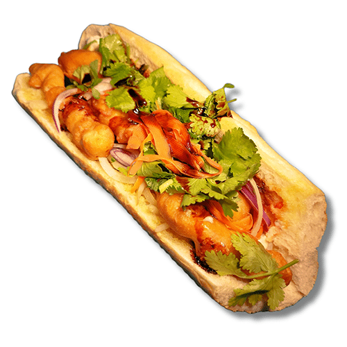 Im Teigmantel knusprig frittierte Hühnchenteile, Gemüse und Baguette, ergänzt durch die belebende Frische von knackigem Salat, eingelegten Möhren, Rettich, Zwiebeln, Gurken, Röstzwiebeln und Koriander.